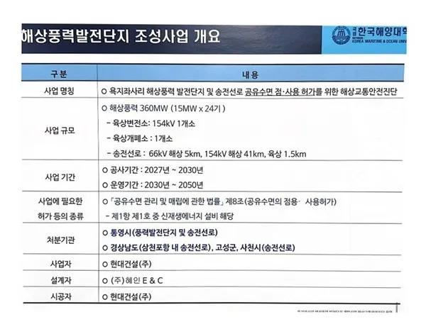 통영미래해상풍력은 경남 통영시 욕지면 동향리·좌사리 해역 일원 공유수면에 360MW급 해상풍력 발전단지를 개발하기 위해 설립된 현대건설의 100% 자회사다. 사업은 15MW급 발전설비 24기와 함께 송전 및 변전설비로 구성되며, 총 사업비는 약 2조6000억원, 이 중 예상 공사비는 약 1조원으로 추정된다.